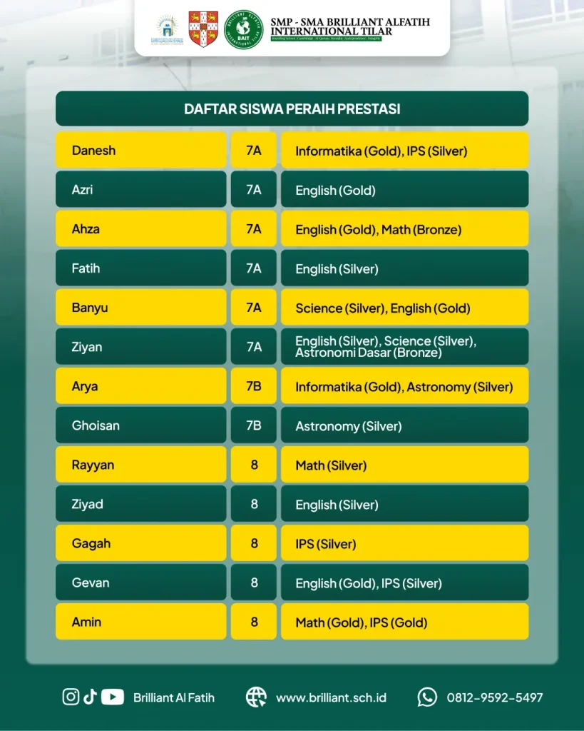 Brilliant Al Fatih International Islamic Boarding School kembali menorehkan prestasi membanggakan di tingkat nasional. Sejumlah santri berhasil meraih medali emas, perak, dan perunggu dalam ajang Olimpiade Sains Pemuda Indonesia yang diselenggarakan oleh Pusat Kejuaraan Sains Nasional (PUSKANAS).