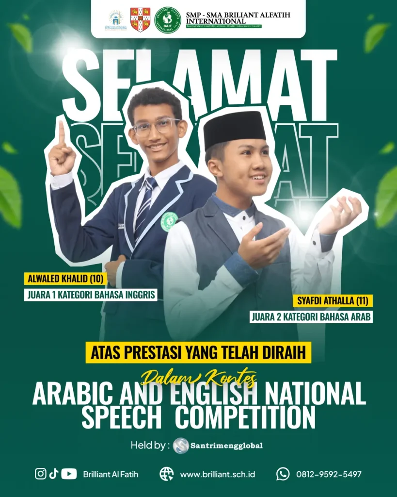 Prestasi ini menjadi bukti nyata bahwa santri Brilliant Al Fatih tidak hanya unggul dalam akademik, tetapi juga mampu berkompetisi secara nasional dengan kepercayaan diri, kecakapan bahasa, dan visi keislaman global.