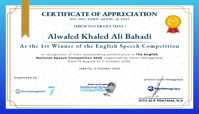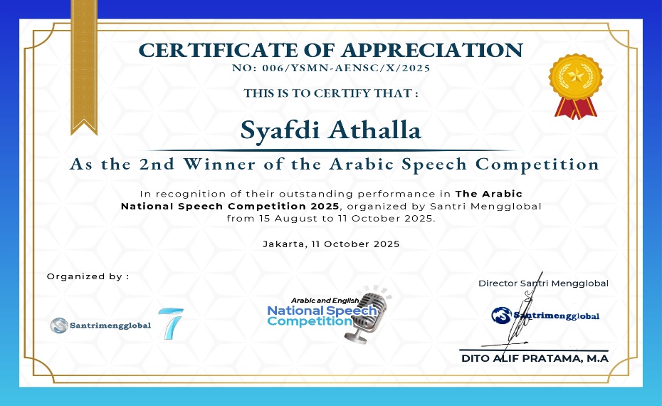 Pada National Speech Competition yang diselenggarakan oleh Santri Mengglobal, berlangsung pada 15 Agustus โ€“ 11 Oktober 2025.